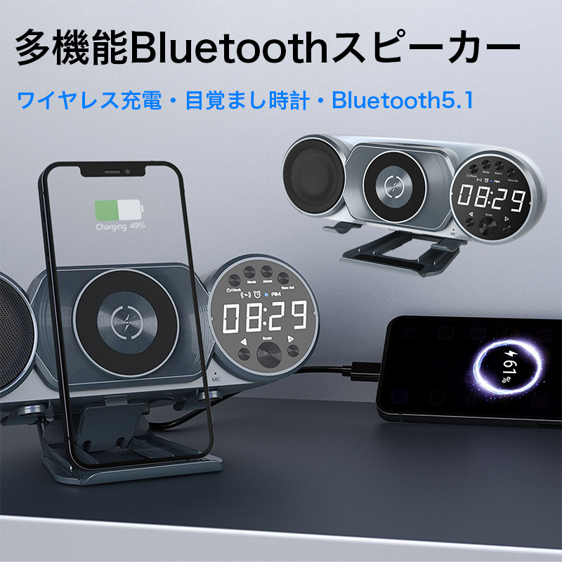 スピーカー Bluetooth 目覚まし時計 ワイヤレス充電器 スマホホルダー ワイヤレススピーカー 高音質 時計 ブルートゥース TFカード対応 マイク内蔵 ライト