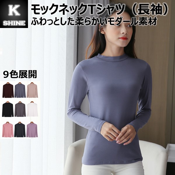 【2点で10%クーポン】 Tシャツ モックネック 長袖 レディース 無地 9色 インナー レーヨン 柔らかい ハイネック 白 黒 [SMT(MN)(L)]