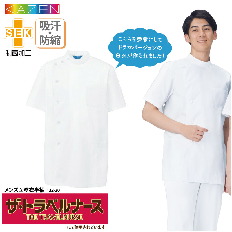 医務衣 ケーシー 医療 白衣 医師 ドクター メンズ 男性用 白 ホワイトドラマ トラベルナース メディカル 吸汗 制菌 SEK KAZEN カゼン 132-30 刺繍 プリント