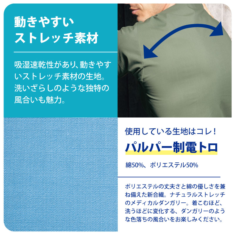 素材のタフさを追求するとともに、ストレッチ性も確保。おしゃれで快適なスクラブです。