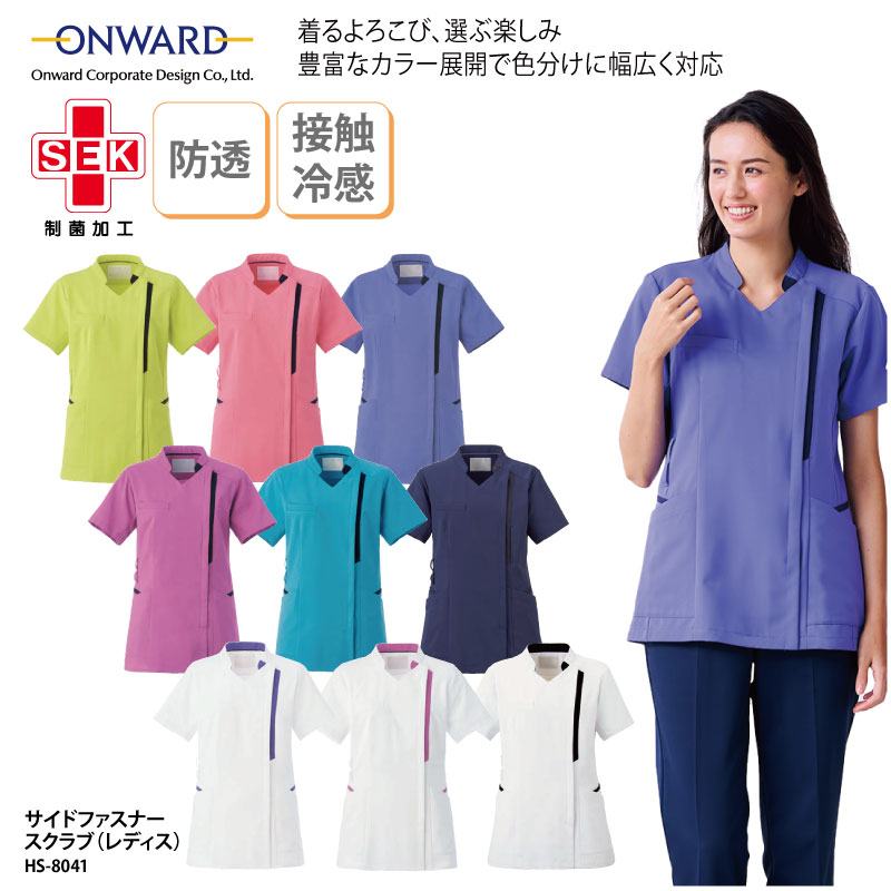 スクラブ レディス 女性用 半袖 サイドファスナー 白衣 看護 ナースウェア 医師 ドクター 介護 メディカル 制菌 オンワード ONWARD HS-8041 刺繍 プリント