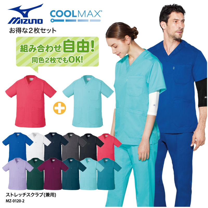 スクラブ お得な2枚セット 接触冷感 白衣 医療 男女兼用 看護 介護 ナース ストレッチ 手術衣 MIZUNO MZ-0120 刺繍 プリント