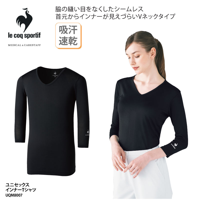 インナー Tシャツ スクラブ 医療 白衣 アンダーウェア 七分袖 看護師 男女兼用 メッシュ 吸汗速乾 重ね着 ブラック 日焼け ルコック UQM8007