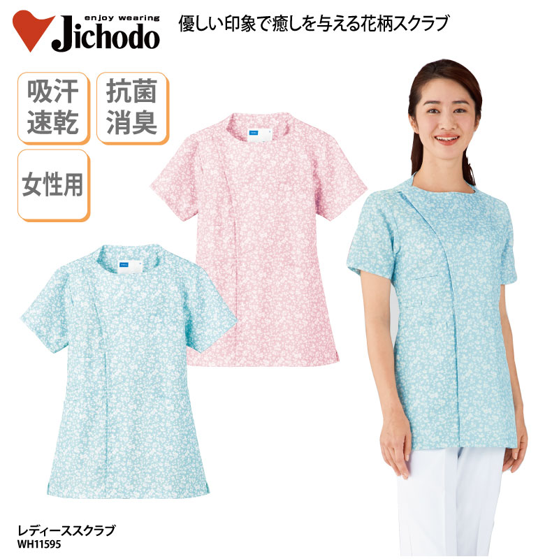 スクラブ 半袖 女性用 レディース ブルー ピンク 花柄 介護士 看護師 ナース クリニック 抗菌 消臭 吸汗 速乾 WHISEL ホワイセル WH11595 刺繍 プリント