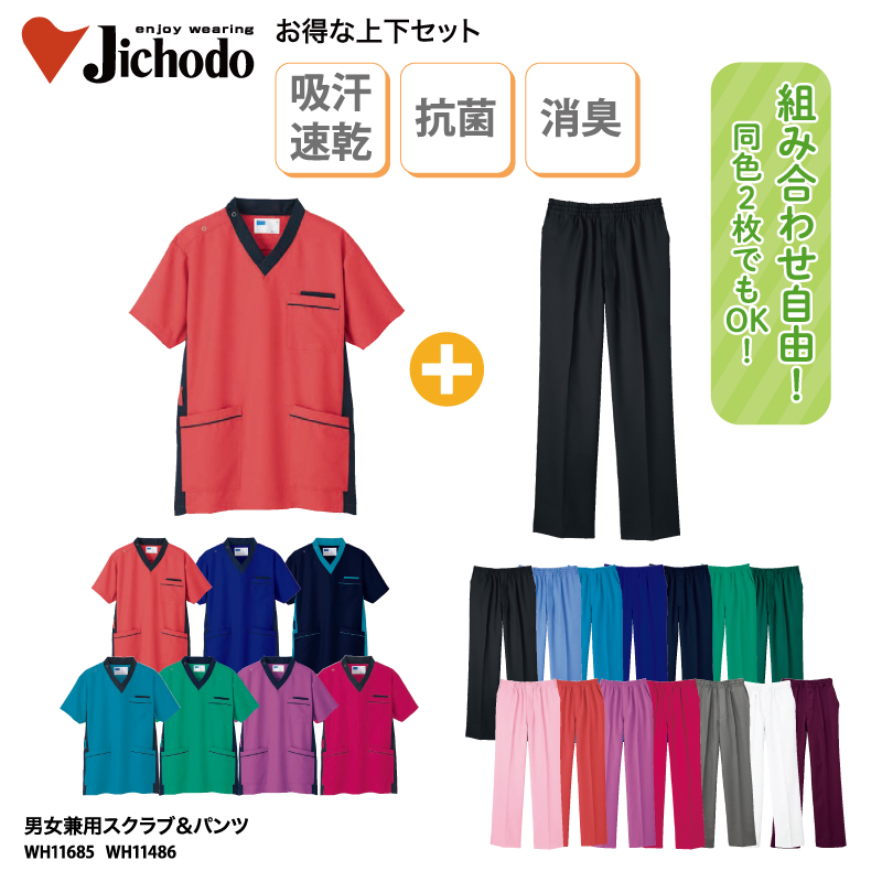 スクラブ パンツ お得な上下セット 医療 白衣 格安 抗菌 制電 看護師 男女兼用 動物病院 ホワイセル WH11685 WH11486 裾上げ 刺繍 プリント