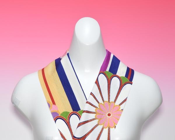 振袖用半衿 702 東レシルック カラフルな縞に大きな菊と桜 短尺 クリックポスト発送
