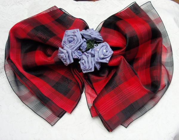 女性用の兵児帯です。ジュニアーから大人までお使いいただけます。当店の手作り品で新品です。飾りの花はイメージで実際には付いておりませんのでご了承下さい。素材は赤と黒のチェックのオーガンジーです。サイズは全長395センチ・幅45センチです。手作りのため、サイズにバラツキがありますのでご了承ください。