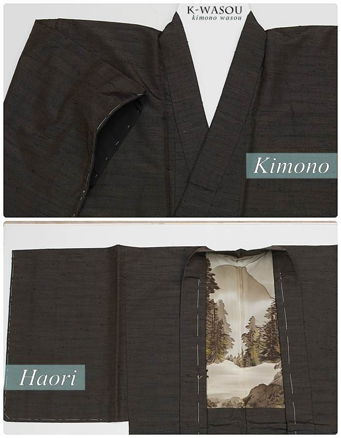 同じ共生地で着物と羽織のセットとなったアンサンブル着物となっています。