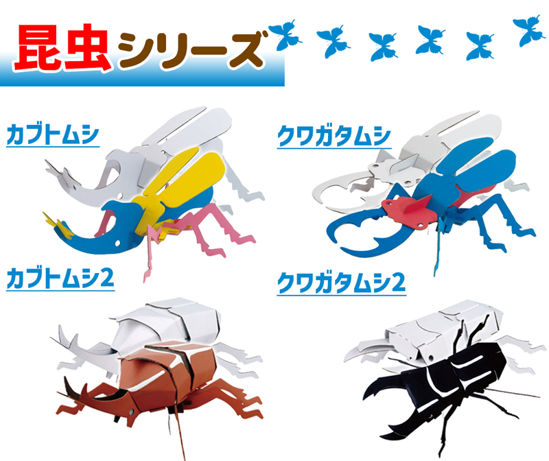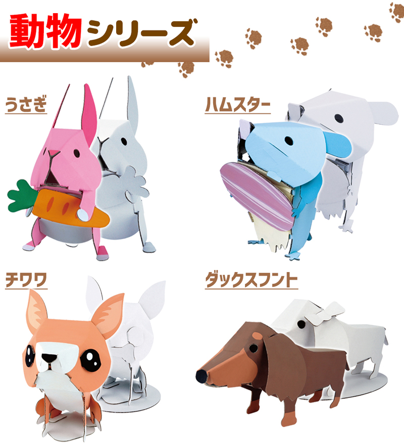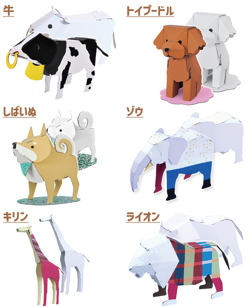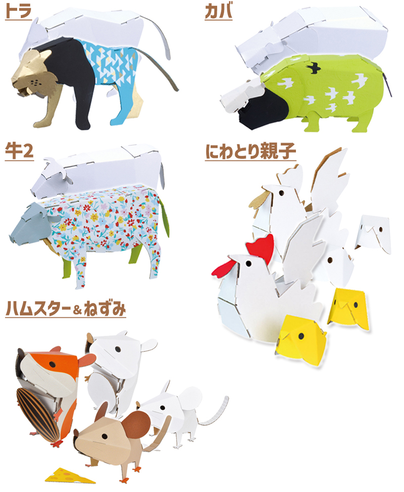 | 【カブトムシ】長さ200×幅120×高さ120mm/★(組立時間目安:10分) 【クワガタムシ】長さ220×幅120×高さ110mm/★(組立時間目安:10分) 【ヘラクレスオオカブト】長さ260×幅130×高さ80mm/★(組立時間目安:10分) 【ギラファノコギリクワガタ】長さ230×幅130×高さ80mm/★(組立時間目安:10分) 【チョウ&カマキリ】チョウ:長さ135×幅195×高さ30mm、カマキリ:長さ230×幅150×高さ130mm/★★(組立時間目安:15分) 【うさぎ】長さ100×幅90×高さ160mm/★★(組立時間目安:15分) 【ハムスター】長さ100×幅100×高さ120mm/★★(組立時間目安:15分) 【チワワ】長さ125×幅90×高さ125mm/★★(組立時間目安:15分) 【ダックスフント】長さ195×幅110×高さ95mm★★(組立時間目安:20分) 【牛】長さ170×幅70 ×高さ115mm/★★(組立時間目安:20分) 【トイプードル】長さ120×幅95×高さ125mm/★★(組立時間目安:20分) 【しばいぬ】長さ160×幅80×高さ150mm/★★(組立時間目安:20分) 【電車(赤/黄/緑)】長さ195×幅55×高さ100mm(印刷あり)/★★(組立時間目安:20分) 【ティラノサウルス】長さ340×幅50×高さ130mm/★★(組立時間目安:20分) 【トリケラトプス】長さ270×幅50×高さ120mm/★★(組立時間目安:20分) 【ステゴサウルス】長さ240×幅65×高さ120mm/★★(組立時間目安:15分) 【ブラキオサウルス】長さ380×幅60×高さ270mm/★★(組立時間目安:20分) 【ナウマンゾウ】長さ250×幅70×高さ140mm/★★(組立時間目安:20分) 【スピノサウルス】長さ335×幅60×高さ160mm/★★(組立時間目安:20分) 【プテラノドン】長さ220×幅430×高さ150mm/★★(組立時間目安:20分) 【カブトムシ2】長さ215×幅170×高さ80mm/★★★(組立時間目安:30分) 【クワガタムシ2】長さ190×幅160×高さ55mm/★★★(組立時間目安:30分) 【ゾウ】長さ250×幅95×高さ180mm/★★★(組立時間目安:30分) 【キリン】長さ220×幅70×高さ370mm/★★(組立時間目安:20分) 【ライオン】長さ185×幅85×高さ125mm/★★★(組立時間目安:30分) 【トラ】長さ230×幅75×高さ112mm/★★(組立時間目安:20分) 【カバ】長さ205×幅155×高さ136mm/★★(組立時間目安:15分) 【ウシ2】長さ220×幅75×高さ125mm/★★(組立時間目安:20分) 【にわとり親子】親:長さ125×高さ115mm、子:長さ80×高さ40mm×2匹/★★★(組立時間目安:30分) 【ハムスター&ねずみ】ねずみ:長さ200×幅110×高さ100mm、ハムスター:長さ85×幅90×高115mm/★★(組立時間目安:30分) 【クリスマスツリー】長さ140×幅140×高さ210mm(印刷あり)/★★★(組立時間目安:30分) |