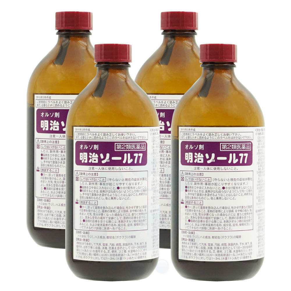 注意 人体に使用しないこと。 ご使用前にラベルをよく読み正しくお使い下さい。 また、必要なときに読めるようにこのラベルをはがさないで下さい。 【してはいけないこと】(守らないと現在の症状が悪化したり、副作用・事故が起こりやすくなります。) ◆薬剤を口や目に入れないこと。 ◆小分け配布をしないこと。 ◆希釈するときは、薬剤がはね返らないようにして均一に撹拌し、手や指で直接かき混ぜるようなことはしないこと。希釈する容器は専用のものとし、他と兼用しない 【相談すること】 ◆万一、誤って薬剤を飲み込んだ場合は、吐かせず直ちに医師の診療を受けること。薬剤の使用により頭痛、目や喉の痛み、咳、めまい、吐気、気分が悪くなった場合などには、直ちに使用を中止し、清浄な空気の場所で安静にして、医師の診療を受けること。 ◆医師の診療を受ける際には、本剤がオルソ剤の殺虫剤であること、および使用薬剤の名称、成分名、症状、被曝状況についてできるだけ詳細に医師へ告げること。 【使用に際しての注意】 ◆定められた効能又は効果に従い、用法及び用量を厳守して使用すること。 ◆薬剤によってアレルギー症状やかぶれなどを起こしやすい特異体質の人は、薬剤の処理作業には従事しないこと。 ◆病人、特異体質者、妊婦、乳幼児などは、薬剤の影響のない場所に移動させること。 ◆環境を汚染しないように乱用を避けること。また養殖池、井戸、地下水などを汚染する恐れのある場所、蜜蜂、蚕(桑)、水棲生物などに被害を及ぼす恐れのある場所では使用しないこと。 ◆食品、食器、飼料、おもちゃ、寝具、衣類、愛玩動物、鑑賞魚、植物、貴重品、美術品、楽器、電気商品などはあらかじめ他へ移すか、あるいは格納し、薬剤がかからないようにすること。 ◆保護具(長袖の作業衣、作業帽、保護メガネ、保護マスク、保護靴、ゴム手袋など)及び使用する機械器具は、あらかじめよく点検整備しておくこと。 ◆使用に際しては、必要量だけを分取し、その都度使い切ること。 ◆本剤と他の薬剤とをむやみに混合したり、加熱したりしないこと。 ◆塗装面やプラスチック、石材、漆喰、白木などに薬剤が付着した場合は変色・変形する場合あるので、覆いなどの処置をして薬剤がかからないようにすること。 ◆本剤は引火性があるので、火気のある場所では使用しないこと。また、電気火花が発生しそうなところでは電源を切ってから使用すること。 ◆小分けするときは、食品用の容器や誤用の恐れのある容器に入れないこと。 【使用中や使用後の注意】 ◆使用に際しては、保護具は必ず着用し、身体の露出部を少なくして薬剤を浴びないようにするとともに、できるだけ吸い込まないように注意すること。 ◆屋内など通気の悪い場所での作業では、十分換気するよう配慮し、処理後は必ず換気をすること。 ◆薬剤の調製、散布中は喫煙、飲食をしないこと。使用中又は使用後にトイレに行くときは、手や顔をよく洗ってから行くこと。 ◆使用後は必ず手や指などを石けんと水でよく洗うこと。また、使用中薬剤が皮膚に付いたときは、直ちに石けんと水でよく洗うこと。万一、薬剤が口、目などに入ったときは、直ちに水でよく洗い流すこと。作業中に大量の薬剤を浴びた場合には、直ちに汚染した衣類を脱ぎ、シャワーを浴びるなどして体に付着した薬剤を洗い落とし、清潔な衣類に着替えること。また、必要に応じて医師の診療を受けること。 ◆作業時の衣服は、他の衣服と区別して洗濯し、保護具も洗剤でよく洗うこと。希釈や薬剤処理に用いた機械器具類もよく洗うこと。 ◆使用済みの空容器などは、石けん水でよく洗い、小児が手に触れないようにするとともに、他に転用しないこと。汚染した器物や洗浄液は作業現場から持ち帰り、河川、湖沼、下水道などの水系や、地下水を汚染する恐れのある場所には捨てないこと。 【保管及び取扱い上の注意】 ◆使用後に残った薬剤は、ラベル表示のある元の容器に密封し、他のものと区別して保管すること。 ◆保管場所は、食品、食器、飼料などと区別し、小児の手の届かない所で、直射日光が当らない乾燥した涼しい場所にすること。 ◆漏洩した場合には、次のように処置すること。 (1)吸収性の媒体、例えば砂、軽石、ボロ布、オガクズなどに吸着させ、広がりを阻止して回収すること。 (2)火災の危険が生じた場合には、すべての火元を止め、火災の誘発を防止する処置を講ずること。 (3)漏洩した薬剤が井戸、池、河川などの水系に流入した場合には、直ちに警察又は保健所に届け出ること。 ◆火災事故の場合には次のように処置すること。 (1)火災の拡大を軽減する最大の措置を講ずること。 (2)薬剤が燃焼すると有害なガスが発生する恐れがあるので、人を避難させること。 第4類・第2石油類・危険等級Ⅲ ・火気厳禁 |