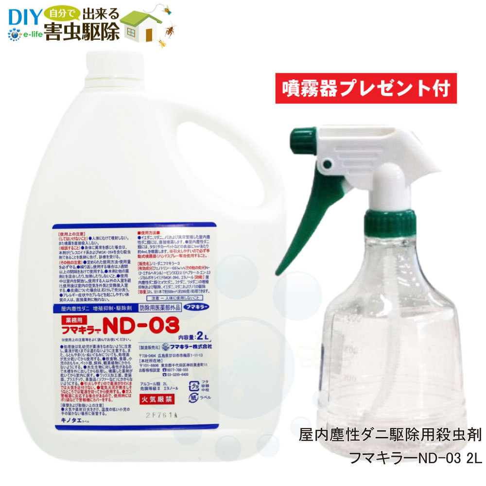 試験方法:和室(6畳)にて実施した。フマキラーND-03を用法用量にしたがって畳表に噴霧し、所定日数後 掃除機にて畳上のゴミを吸い取りダニ数を測定した。 |