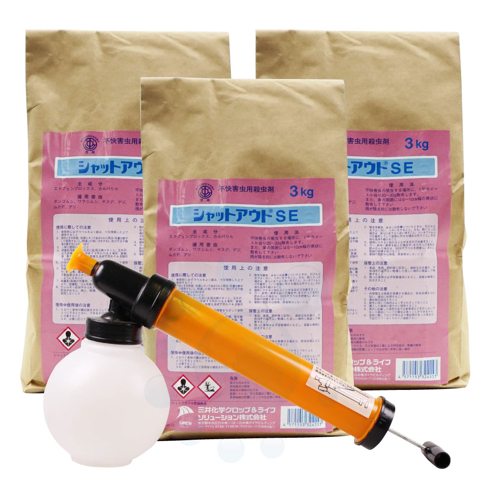 ◆重質粉剤:通常の粉剤より重く作られており、散布中や散布後も飛散しにくくなっています。 ◆低臭性でニオイの心配が少ない。 ◆持続効果に優れ、長期間(1〜2ヶ月)ムカデ・ヤスデ・ゲジなどの侵入を防止します。 ※雨や湿度により効果が早く切れる場合もあります。 |