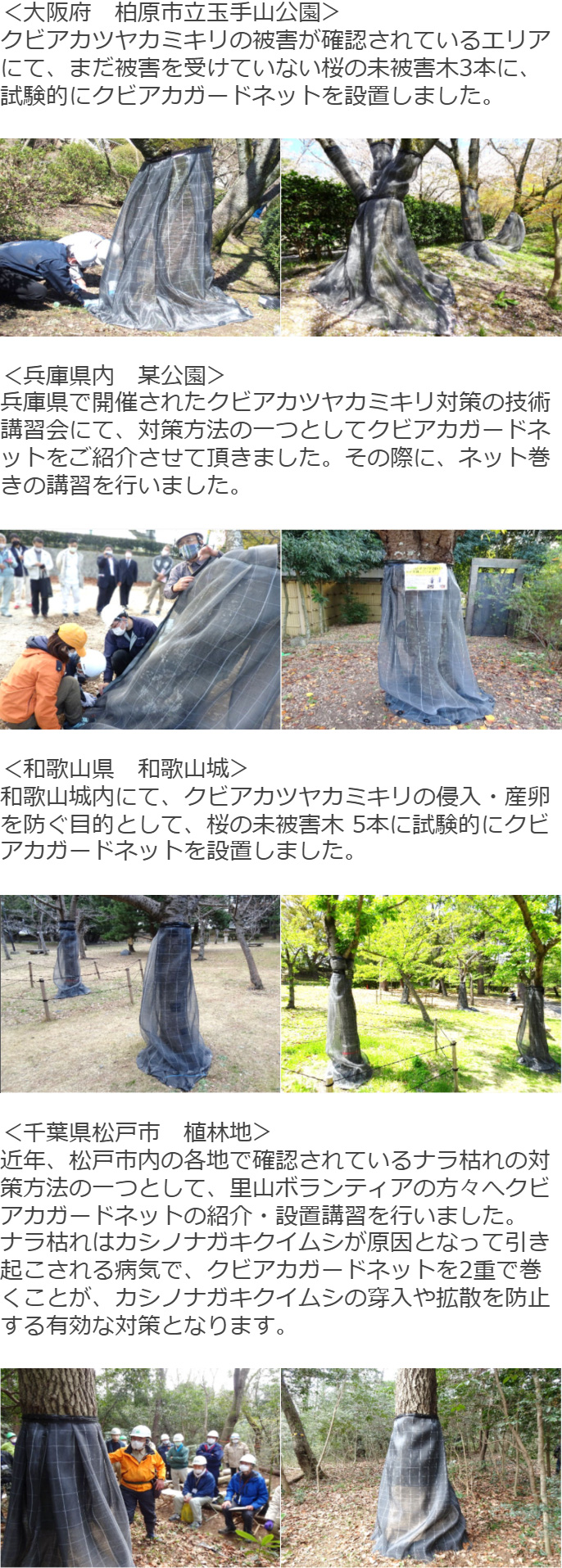 ◆クビアカガードネット®設置の際には、事前に施工の信頼性を向上するための施工手順要領書をご確認ください。 ◆施工手順要領書は、あくまでも基本となる施工手順をご案内する資料です。施工方法は現場の状況に合わせて工夫をお願いします。 ◆ネットを巻く際には、外からの産卵や被害樹木の内部からの噛み切りを抑制するために、出来る限りネットと樹は密着させず浮かすようにして設置して下さい。 ◆被害木でネット内に新たなフラス堆積が見られた場合、排糞孔を特定して刺殺や殺虫エアゾール剤・樹幹注入剤等の登録農薬を注入するとより効果的です。薬剤使用時は適用樹種を確認してください。 ◆被覆ネット内に樹体から脱出した成虫が発生することがあるので、発見した際は即刻捕殺してください。 ◆クビアカツヤカミキリ捕殺時は交尾産卵後の可能性があります、樹木の経過をしっかり観察して頂き、フラスが排出された 場合は速やかに刺殺・殺虫剤注入を行ってください。 ◆ネット被覆時の粘着テープやシュロ縄は、クビアカガードネット®より早く劣化します。巻き付けて放置する場合は、被害発生シーズン前に必ず点検・補修を行ってください。 |