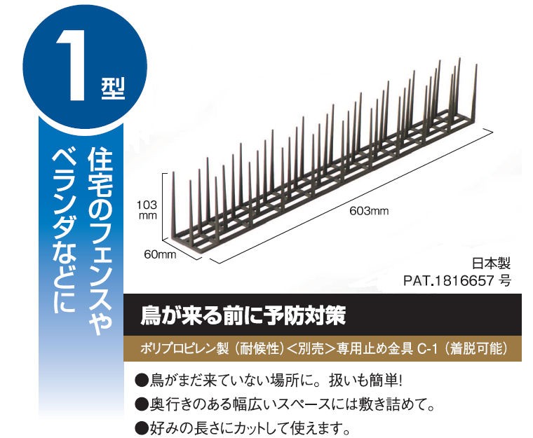 ◆1985年創業。鳥害対策業界でのパイオニア。官公庁や電力、電鉄各社で採用。 30年以上のロングセラー商品で信頼の実績。コーユー独自開発の「特許商品」です! ◆メンテナンスは不要です。しかも改修工事の際は、本体の取り外しも簡単にでき、繰り返し使用できます。(専用金具使用時) ◆耐候性素材で丈夫。屋外耐候試験10年クリア。 ◆プラスチック製で軽い!カットもカンタン!設置もラクラク! ◆先端が丸く、柔らかで軽量な剣山タイプ。 ヒトにも鳥にもやさしい設計です。 | |