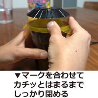 1.誘引捕獲液の入った袋を開けずによく振ってください。 2.袋を開封して下容器の中にすべて入れてください。(誘引捕獲液がこぼれないよう注意してください) 3.下容器に示されたラインまで水を加えてください。 4.フタと下容器側面の[▼]マークを合わせてはめ、フタに記載された「まわす」という印字方向にカチッとはまるまでまわしてください。 【組み立て・設置方法】 フタの部分に屋根をカチッとはまるように取り付けます。 注意喚起シールを下容器の側面に貼り付け、付属の吊下げひもをフタの上部の穴に通して庭木などに吊るしてください。 設置後は、ハチが誘引され飛来するので、不用意に近づいたり、ハチを刺激したりしないよう十分注意してください。 【効果的な設置場所】 地面より1〜3mくらいのところ ハチをよく見かける場所 緑が多くある場所 |