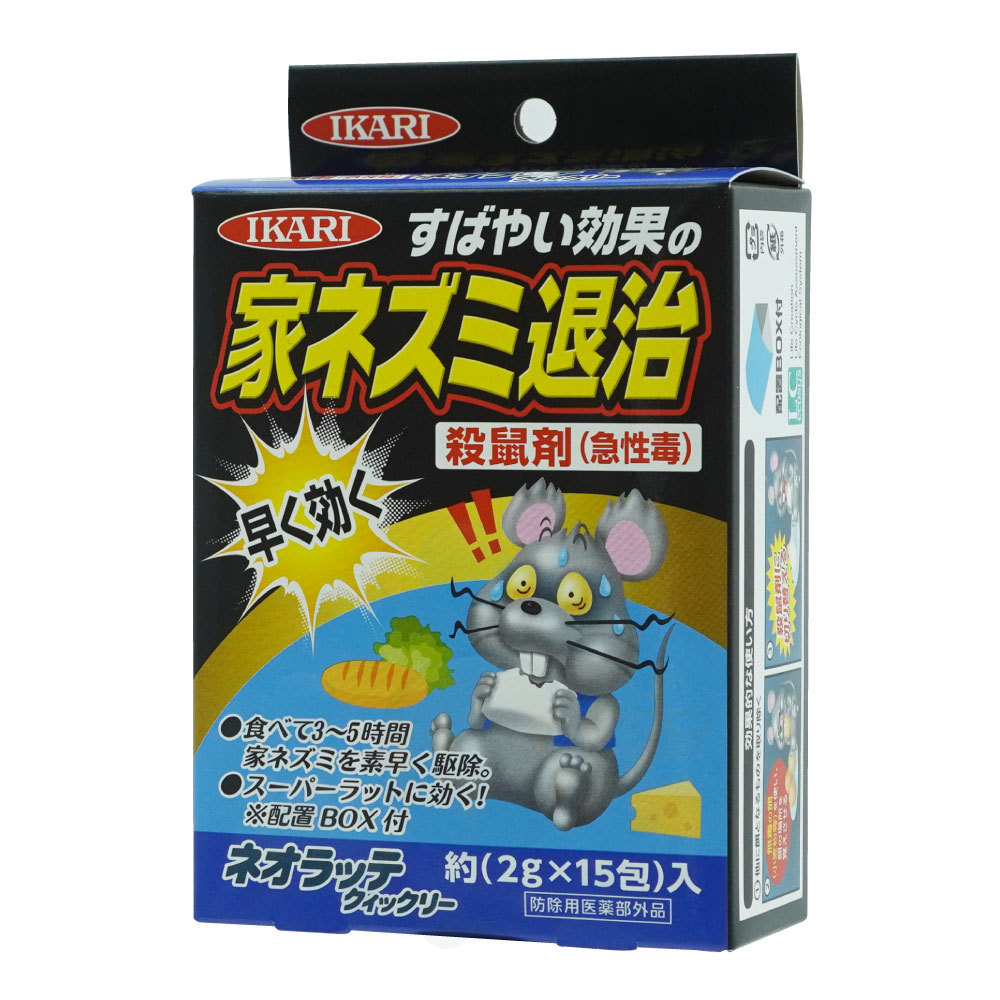 1.本剤2〜4g(1〜2包)をネズミのよく出るところ、または通路に配置してください。 2.ネズミは警戒心がとても強いので、食べるまで時間がかかることがあります。数日は様子を見てください。 ※人やペットの誤食に注意し、状況によって付属の配置BOX(誤食防止用)をご使用ください。 【確実にネズミに食べさせるコツ】 1.他に餌となるものを取り除く 2.無毒の餌(小麦粉等)を使い餌の場所を覚えさせる ↓ 殺鼠剤に切り替える | |