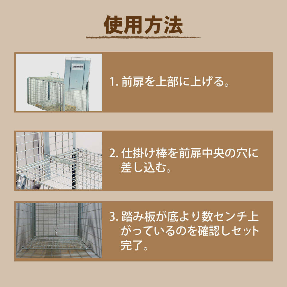 1.前扉を上部に上げる。 2.仕掛け棒を前扉中央の穴に差し込む。 3.踏み板が底より数センチ上がっているのを確認しセット完了。 |