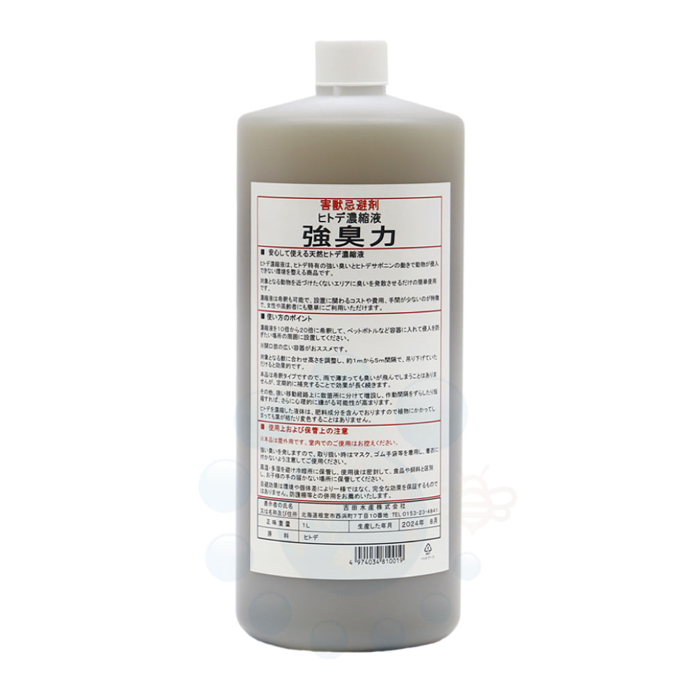 農薬成分や化学合成成分を一切含まない! 安心して使える 天然ヒトデ濃縮液 ◆「強臭力」は、北海道根室産の天然ヒトデを原料とし、臭いに特化した希釈して使える液体忌避剤です。 ◆ヒトデは、体内にカドミウムや鉛などの重金属を多く含むことがある海洋生物として知られており、有害成分分析による安全確認が必要な資材です。 ◆「強臭力」は、重金属分析試験もクリアーした、使用後の環境にも考慮した液体忌避剤です。 <安心して使える天然ヒトデ濃縮液> ◆ヒトデ濃縮液は、ヒトデ特有の強い臭いとヒトデサポニンの働きで動物が侵入できない環境を整える商品です。 ◆対象となる動物を近づけたくないエリアに臭いを発散させるだけの簡単使用です。 ◆濃縮液は希釈も可能で、設置に関わるコストや費用、手間が少ないのが特徴で、女性や高齢者にも簡単にご利用いただけます。 |