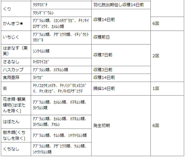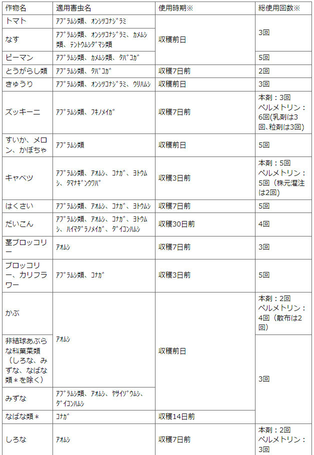 ※印は収穫物への残留回避のため、その日まで使用できる収穫(摘採)前の日数と、本剤及びその有効成分を含む農薬の総使用回数の制限を示します。 【散布剤として使用する場合】 ![]() ![]() ![]() ・希釈倍数:原液 ・使用方法:散布 *「なばな類」には「太田かぶ」が含まれます。 ★みかん、レモン、ゆず、きんかんは作物名のかんきつに含まれる。 【土壌灌注として使用する場合】 ![]() ・希釈倍数:原液 ・使用方法:株元灌注 使用液量の目安:10ml/株は本容器約10回の噴霧量です。 ・2021年10月13日付:ごぼう、キャベツ、だいこん、レタス、リーフレタスの変更、非結球あぶらな科葉菜類(しろな、みずな、なばな類を除く)、みずな、非結球レタス(リーフレタスを除く)、かぶの追加 ・2022年2月9日付:非結球レタス(リーフレタスを除く)、リーフレタスの変更。 |