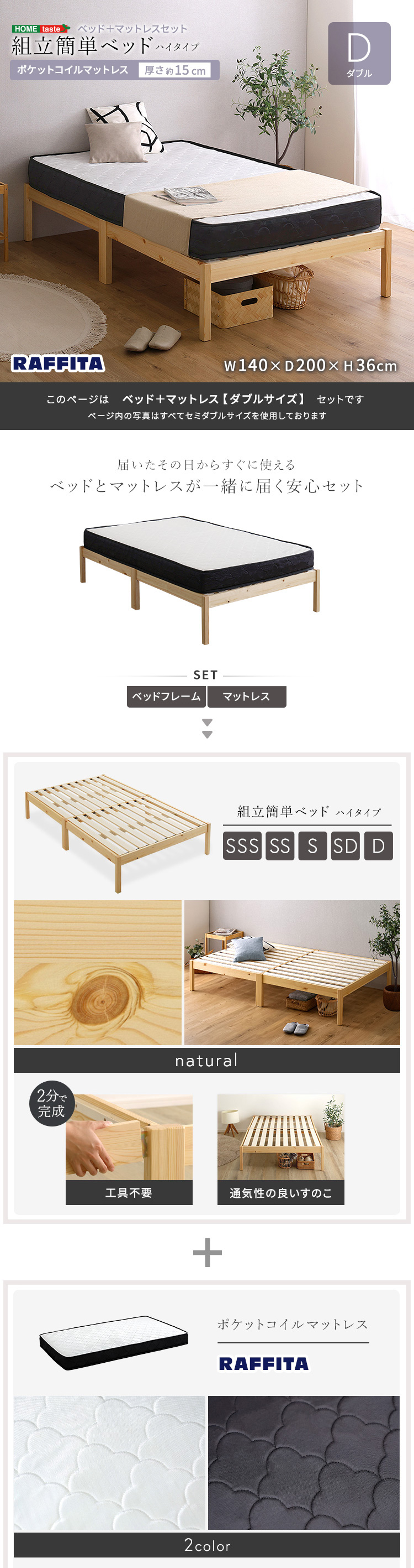 2分で完成!組立簡単ベッド ハイタイプ ポケットコイルマットレスセット(ダブル)