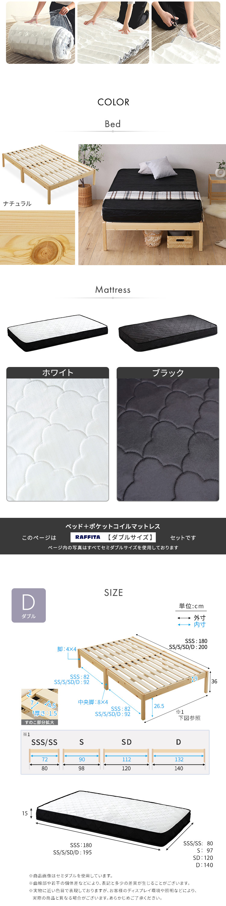 マットレスD:(約)幅140×奥行195×高さ15cm(コイル数:682個)