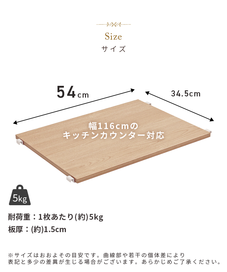 【商品について】別売 キッチンカウンター【Brune-ブラン-】 可動棚■サイズ:(約) 幅54.1x奥行34.2x高さ1.5cm ※1枚当たり■耐荷重:棚板:約5kg/枚■カラー:ナチュラル、ウォールナット、ホワイト■素材:パーチクルボード・メラミン化粧繊維板