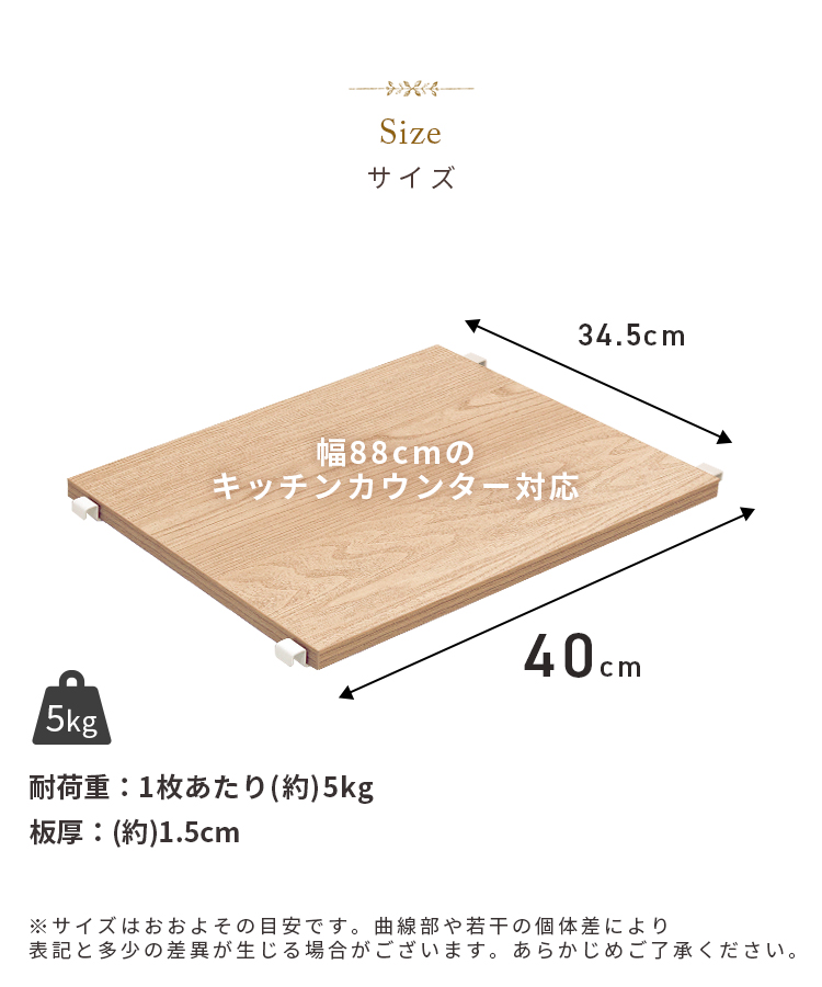 【商品について】別売 キッチンカウンター【Brune-ブラン-】 可動棚■サイズ:(約) 幅40x奥行34.2x高さ1.5cm ※1枚当たり■耐荷重:棚板:約5kg/枚■カラー:ナチュラル、ウォールナット、ホワイト■素材:パーチクルボード・メラミン化粧繊維板