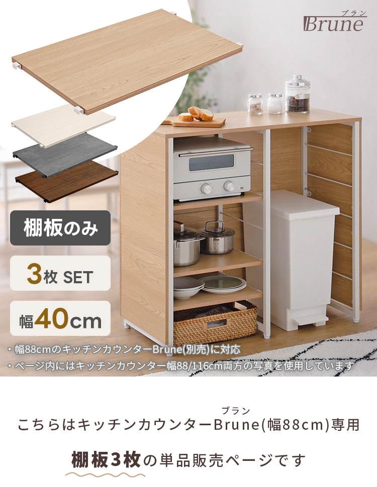【商品について】別売 キッチンカウンター【Brune-ブラン-】 可動棚■サイズ:(約) 幅40x奥行34.2x高さ1.5cm ※1枚当たり■耐荷重:棚板:約5kg/枚■カラー:ナチュラル、ウォールナット、ホワイト■素材:パーチクルボード・メラミン化粧繊維板