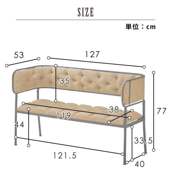 ■アイアンフレーム×ボタン絞りの個性派ソファのご紹介です。 【寸法】幅127×奥行53×高さ77(座面高さ44)cm | |