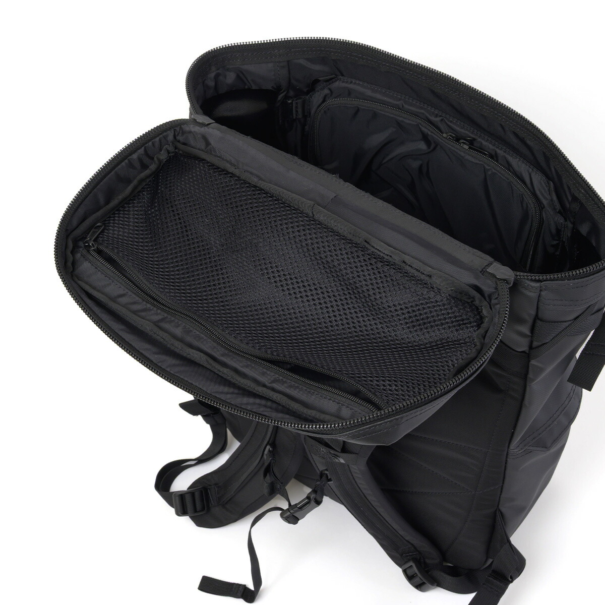 型崩れしにくいボックス形状で、荷物の出し入れが容易にできる大きな開口部。内部には、取り外し可能なインナーオーガナイザーを備え、15インチまでのノート型PCが収納できるパッド付きスリーブを装備しています。サイドにはフラップ付きポケットを設け、使いやすさを向上。