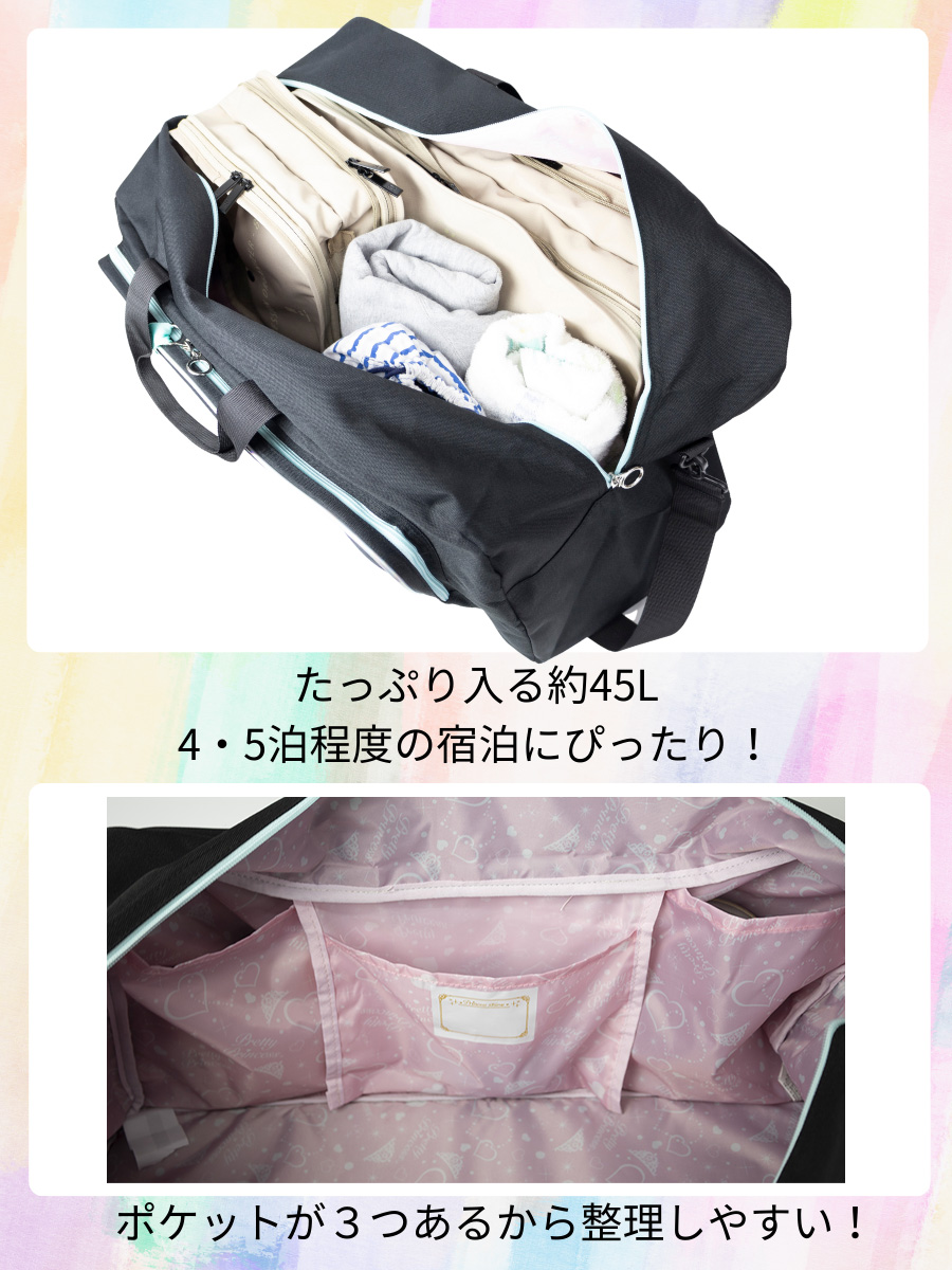 ■小学生にぴったりの大人っぽいけどシンプルかわいいデザインのボストンバッグです。修学旅行 林間学校 合宿 旅行など 3泊 4泊 5泊 程度まで対応する約45Lの大容量タイプ。大容量ですがマチ幅を太めにとることでお子様でも持ちやすいサイズ感に仕上がっています。