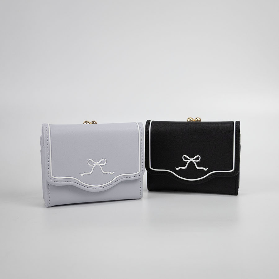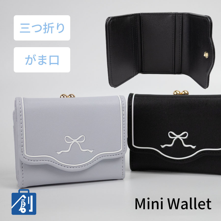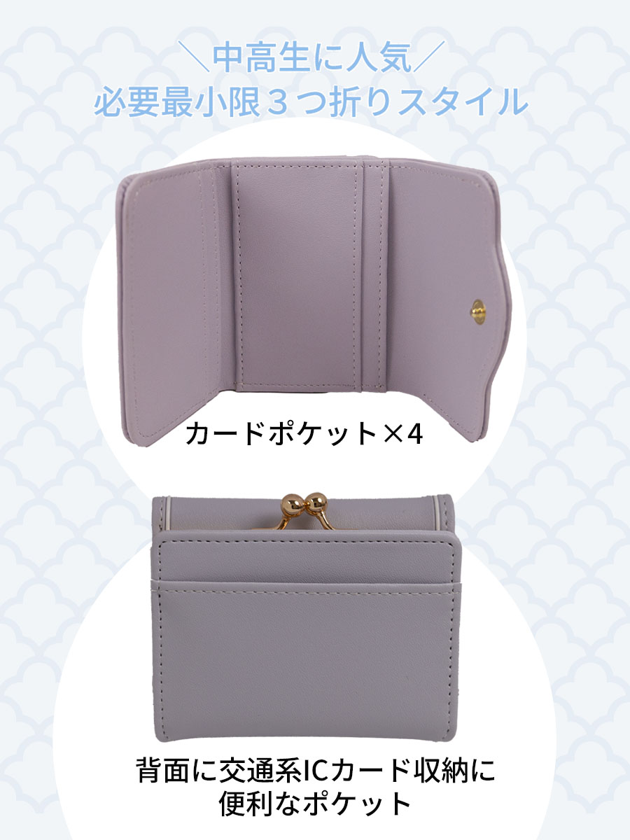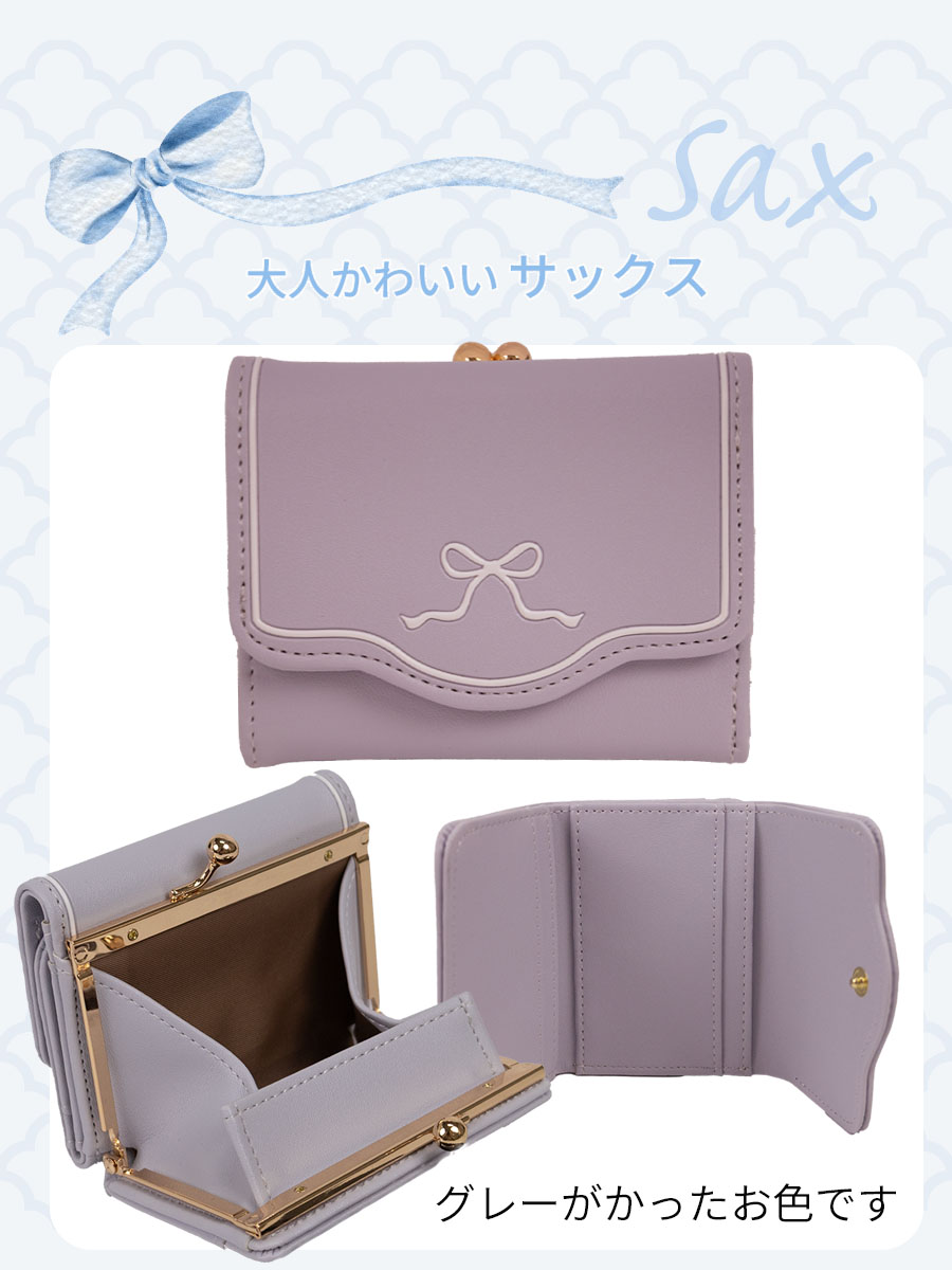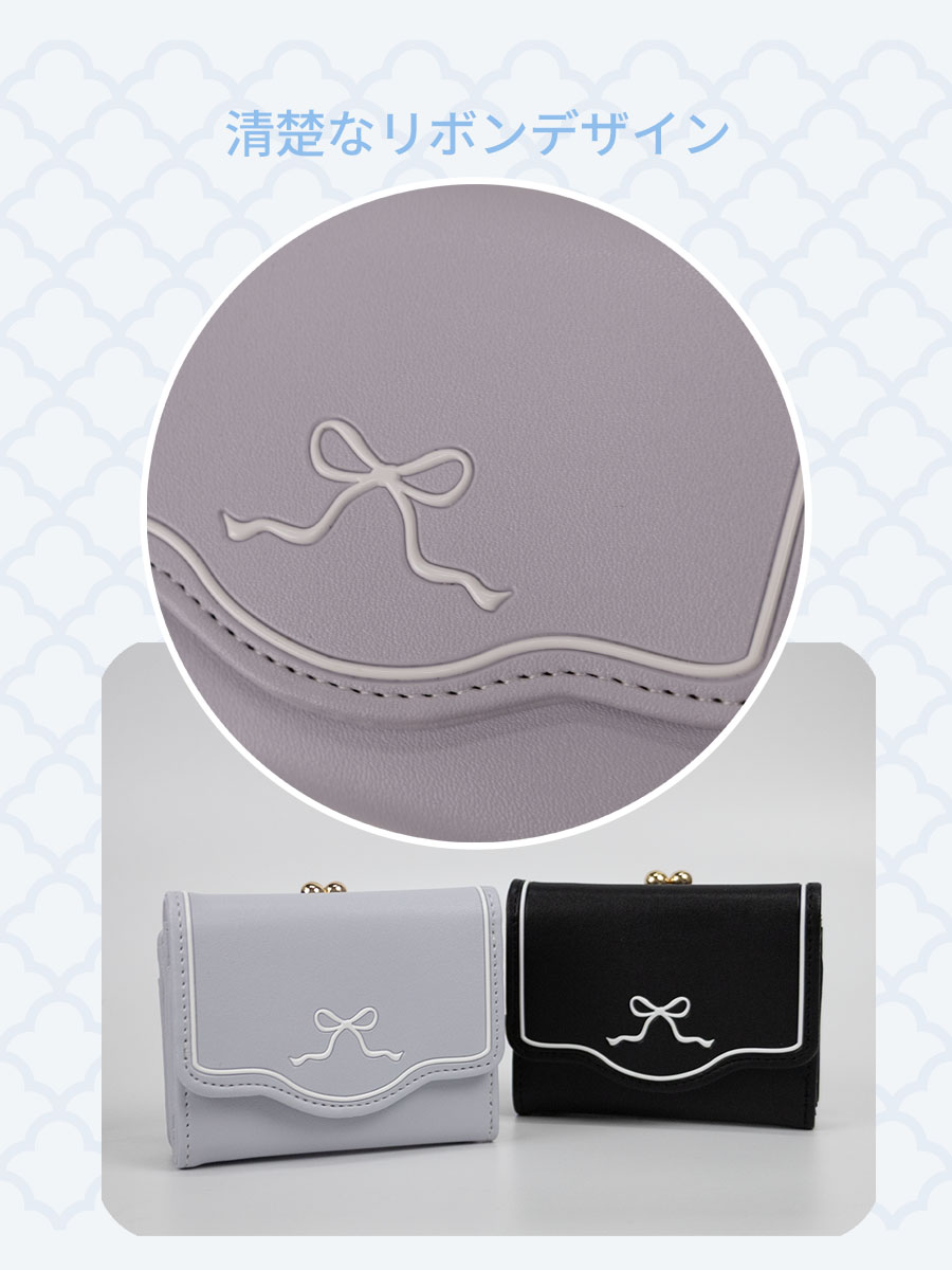 ■白いリボンをポイントにしたシンプルでかわいいコンパクト財布です。人気の3つ折りスタイルで中高生にぴったり!