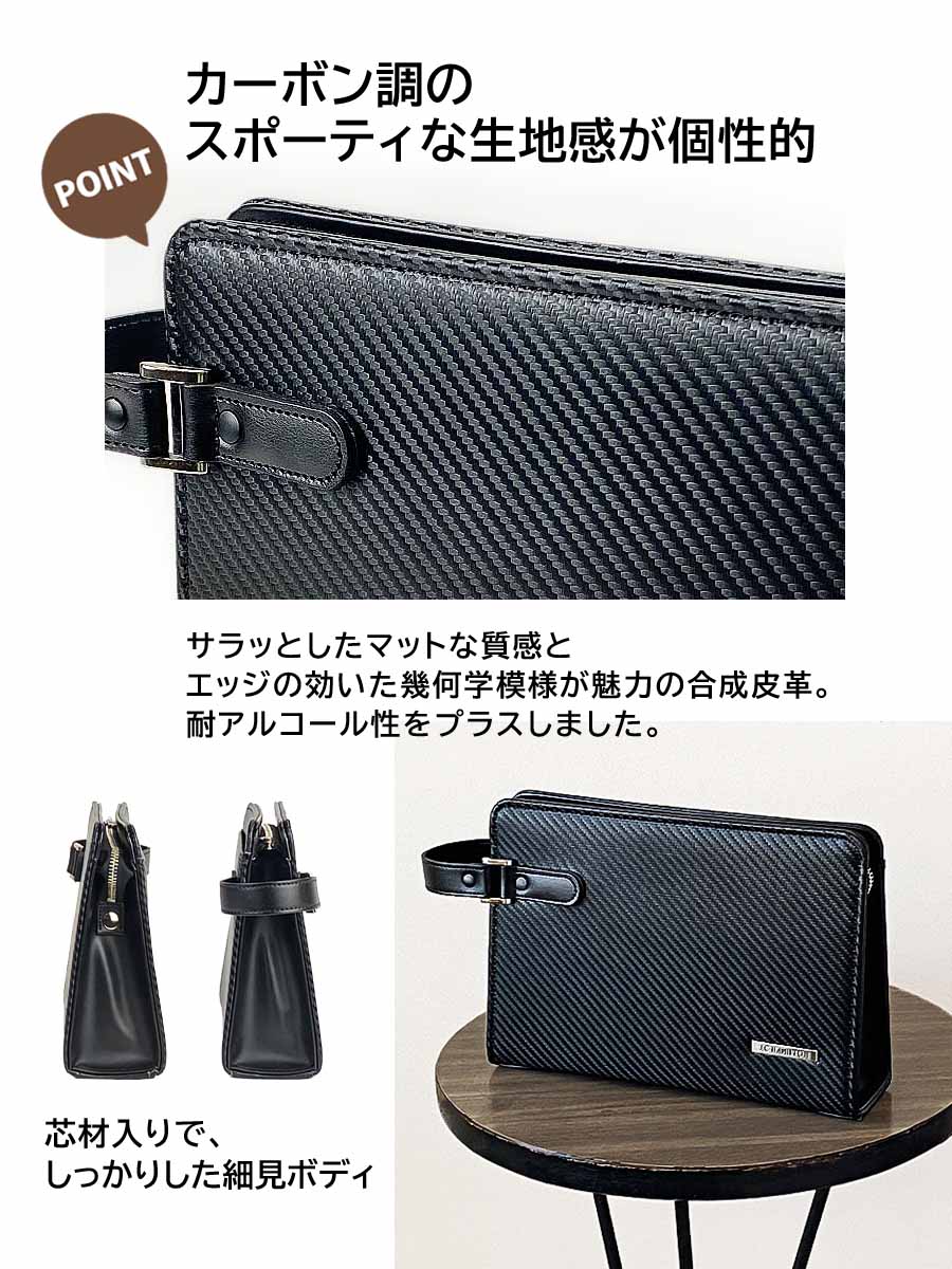 スポーティなカーボン調の生地感が個性的なクラッチバッグ。