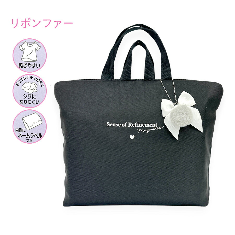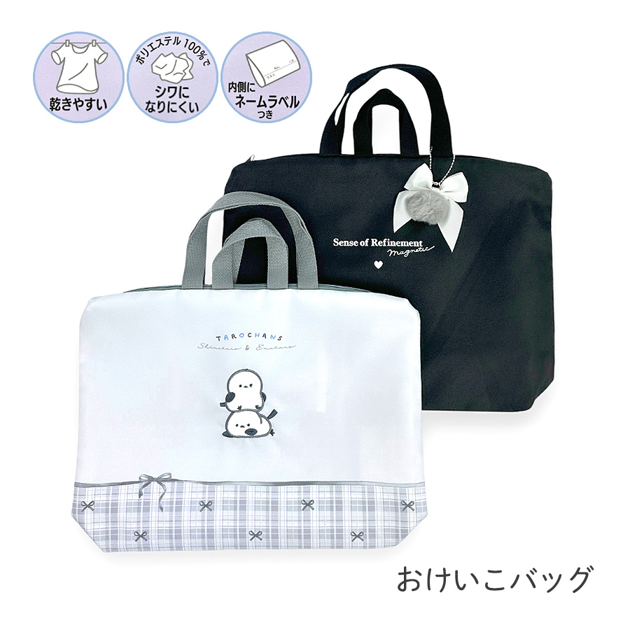 可愛いしまたろろずと大人っぽいブラックカラーにりぼんがおしゃれなレッスンバッグ