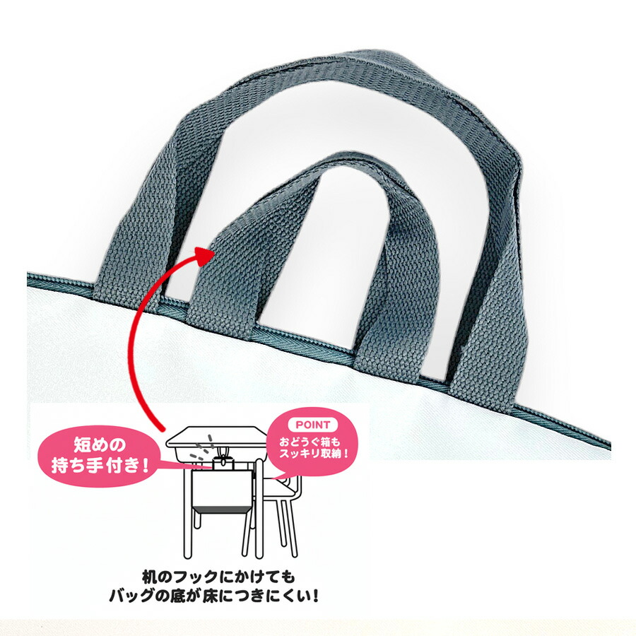 短めの持ち手付きで、机に掛けても底が汚れない仕様が便利です。