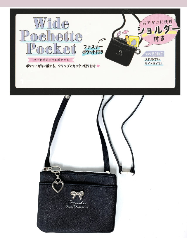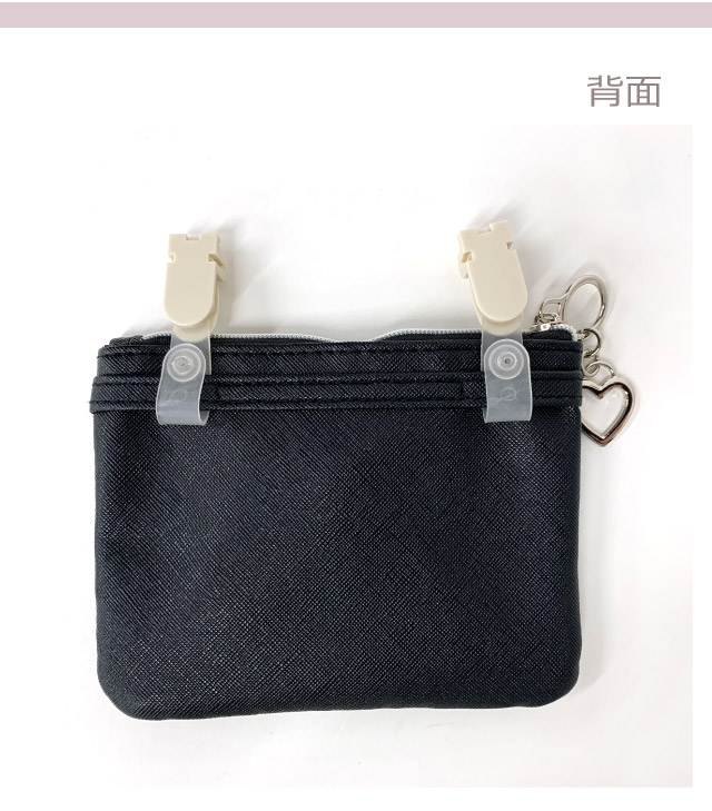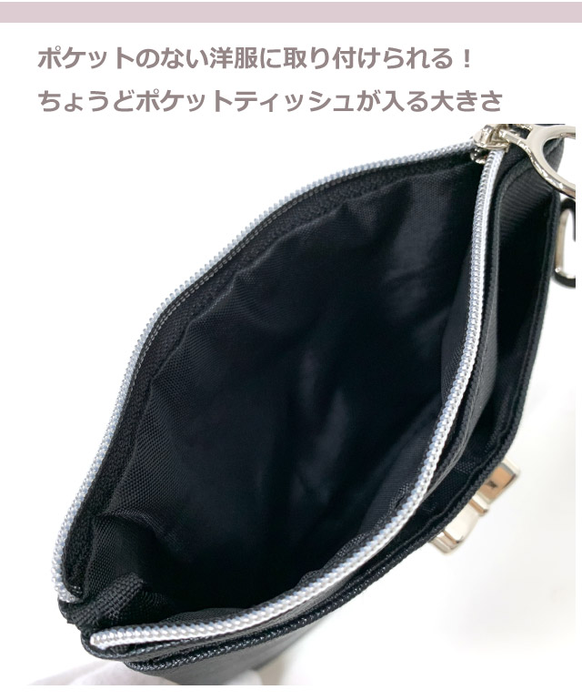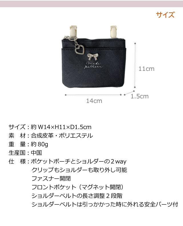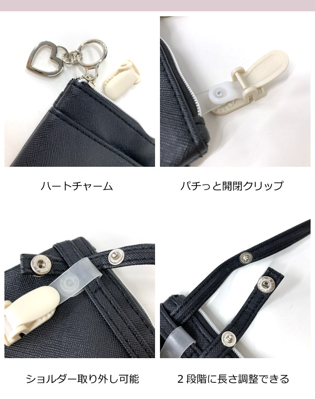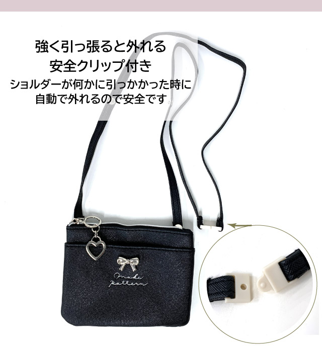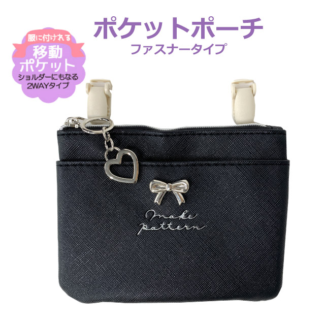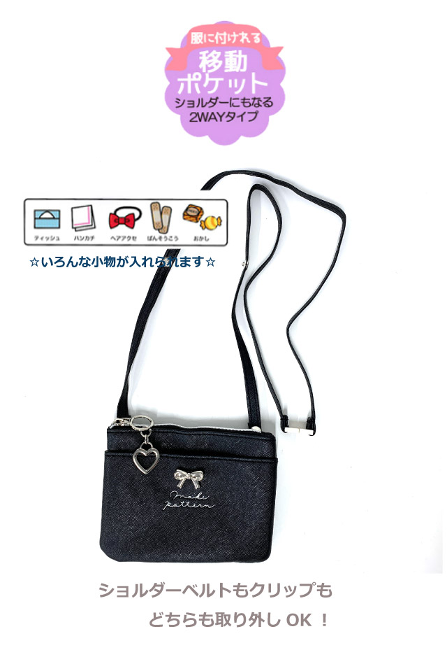 移動ポケット クリップ ポケットポーチ 子供 おしゃれ ショルダー付き 黒 リボン ハート ファスナー 134814