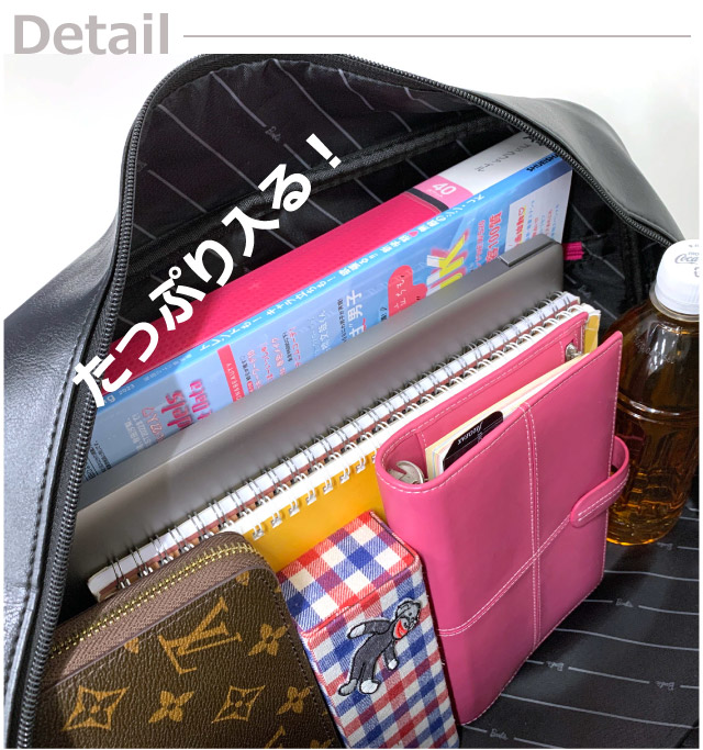 開口部は大きく開くダブルファスナーで、開け閉めが楽です。A4サイズも楽々入り、教科書など必要な荷物に対応。サブバッグとしてもおすすめ。