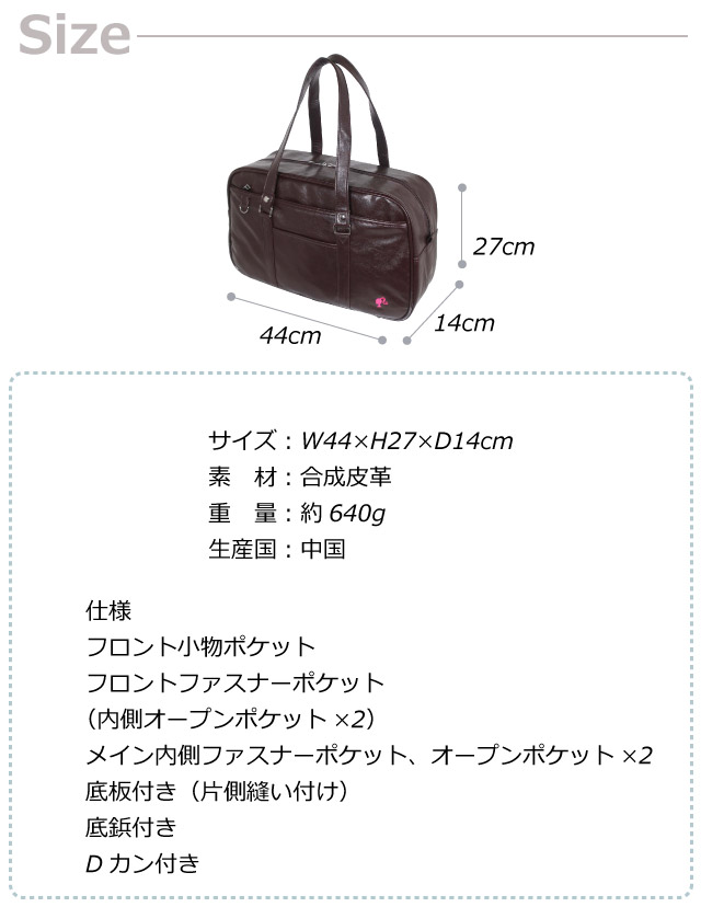 仕 様 | フロント小物ポケット フロントファスナーポケット(内部オープンポケット×2) メイン内側ファスナーポケット、オープンポケット×2 底板付き(片側縫い付け) 底鋲付き Dカン付き |