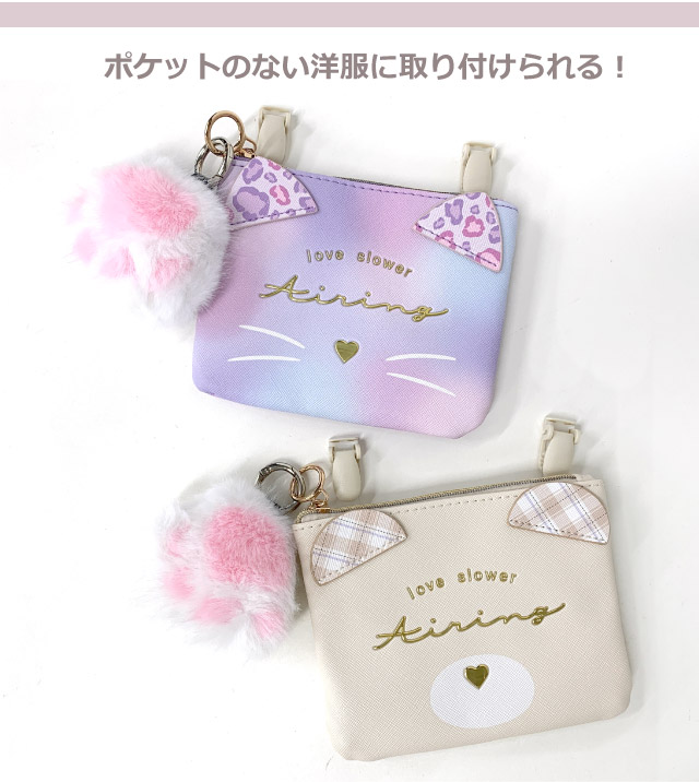 移動ポケット クリップ ポケットポーチ 子供 おしゃれ ショルダー付き ネコ マルチポケット 外付けポケット ファスナー 75147
