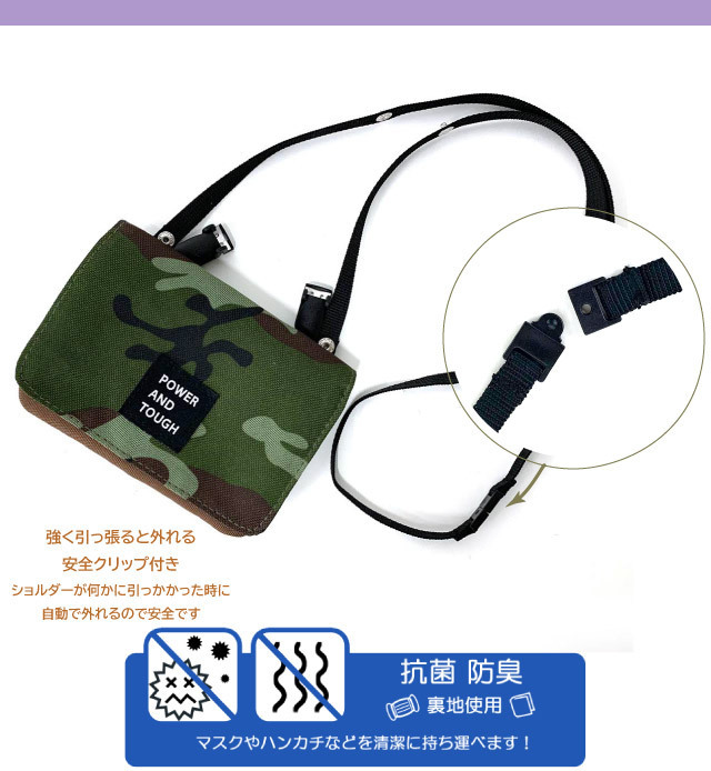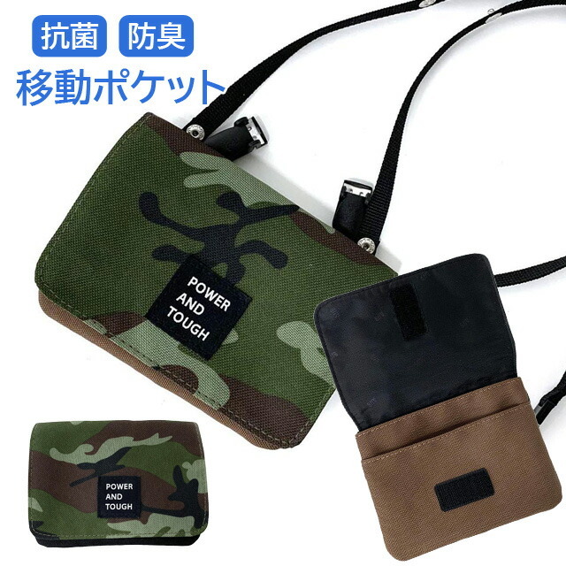 ポケット ポーチ 男の子 迷彩 フラットショルダー g671602 移動ポケット ポシェット キッズ 小学生 男子 高学年 低学年 かわいい クリップ ショルダー ポーチ 移動 黒 茶色 迷彩柄 カモフラ おしゃれ マスク入れ 抗菌 防臭 ショルダー付き 入学 入園 移動バッグ 移動バック