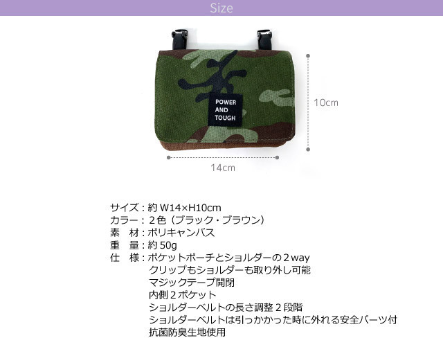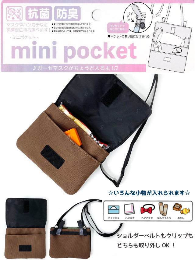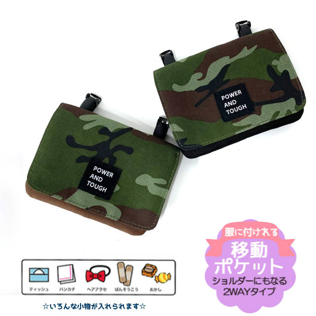 ポケットポーチ 子供 小学校 移動ポケット おしゃれ クリップ ショルダー付き マスク入れ ポシェット 黒 茶色 迷彩 フラットショルダー g671602