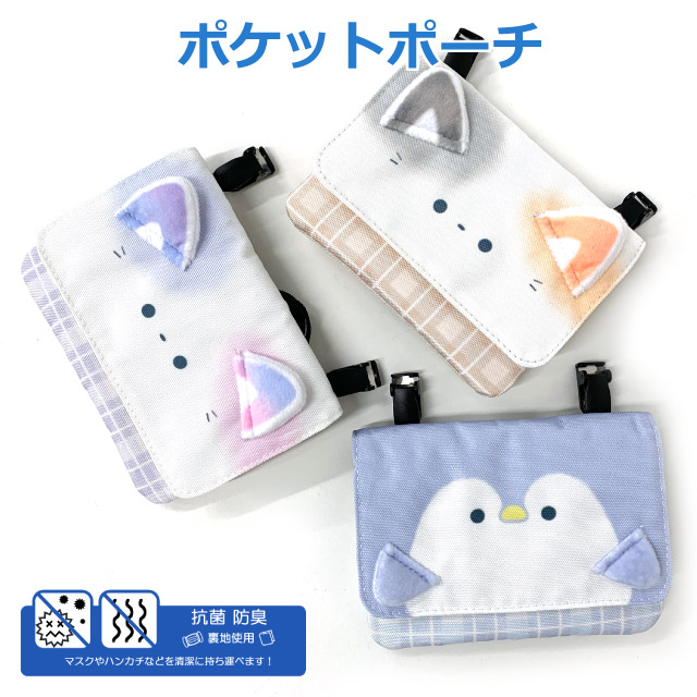 移動ポケット ポケットポーチ 女の子 マルチポケット ネコ 猫 ねこ ペンギン かわいい ポケット ポーチ クリップ ショルダー ポシェット ティッシュ入れ キッズ 小学生 女子 ジュニア 水色 紫 マルチポケット 抗菌 防臭 入学グッズ 付けポケット 外付けポケット mnv-531
