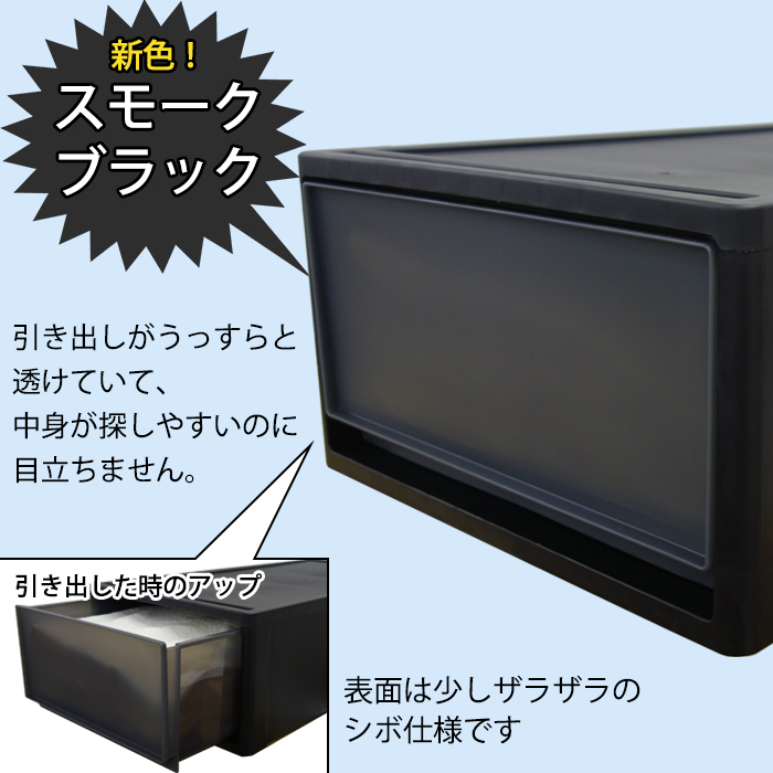 | 特徴 | KABAROCK限定オリジナルカラー仕様! 新カラーで引き出しがうっすら透けてるスモークブラックが登場! 押入れ収納にオススメの奥行74cm 1段チェスト。 1段ずつでも、奥行同サイズ同士で重ねても、お好みのレイアウトでお使いいただけます。 シンプルなつくりだからこそ、見出しやステッカー等を貼ってアレンジも自由自在。 カッコいい収納アイテムをお探しの方に、オススメです。 |