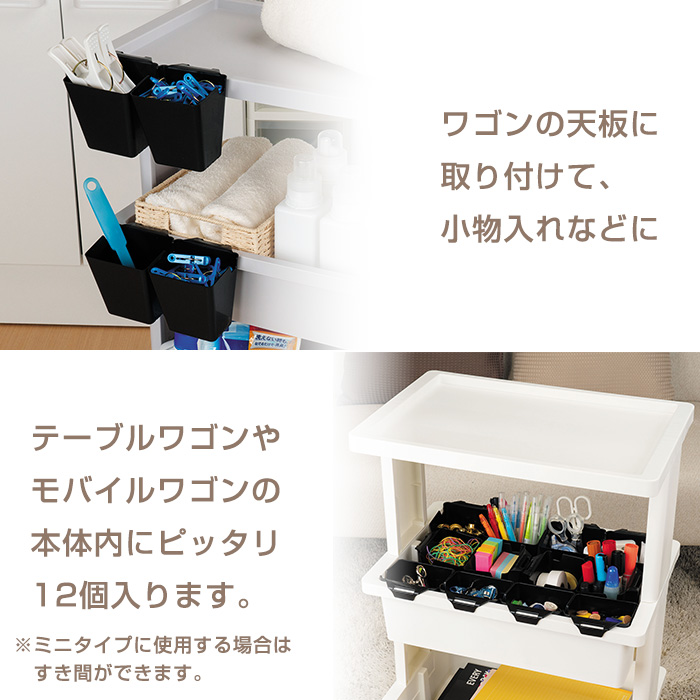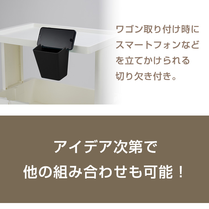 | 特徴 | リセスタイルワゴンに取り付けられるワゴンポケットです。 本体内のインナーケースとしてテーブルワゴン・テーブルワゴン3段プラス・テーブルワゴン引出付ウッドやモバイルワゴンにピッタリ12個入ります。 他にも扉の取っ手に引っ掛けて小さなゴミ箱としても使えます。 ワゴン取り付け時にスマートフォンなどを立てかけられる切り欠き付き。 |
