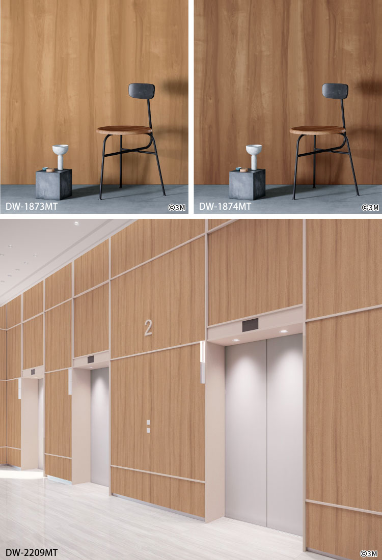 特殊マットコーティングをフィルム表面に施すことにより、光沢のない無垢で優しい質感と、無垢材のような毛羽立った触感を再現した木目シリーズ。