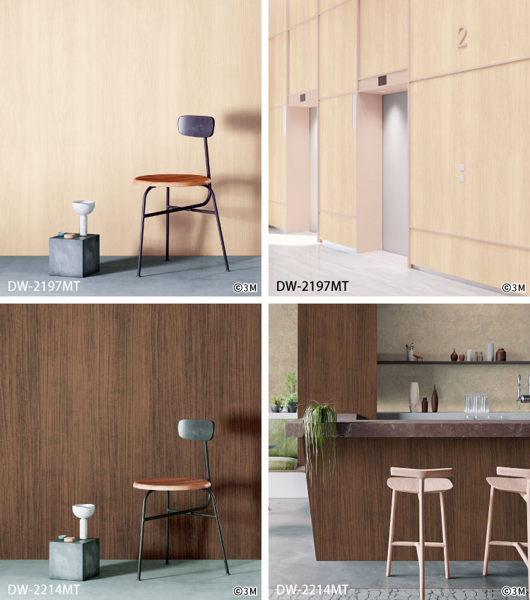 特殊マットコーティングをフィルム表面に施すことにより、光沢のない無垢で優しい質感と、無垢材のような毛羽立った触感を再現した木目シリーズ。