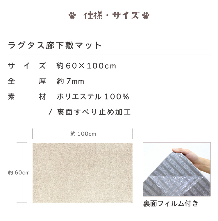 長さ100cm ラグタス 廊下敷ロングマット 約60×100cm 全4色 イエロー ブラウン ベージュ グレー ペット対応 すべり止め付き 丸洗い