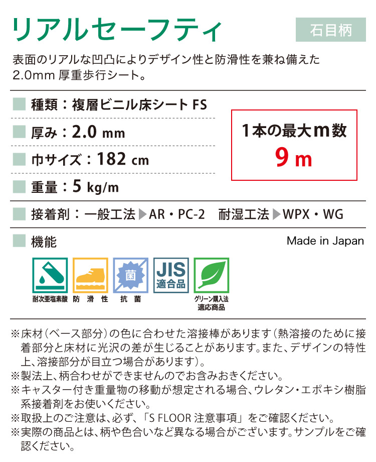 サンゲツ 長尺シート Sフロア リアルセーフティ 182cm巾 2mm厚 防滑シート 抗菌 石目調 [1m以上10cm単位 切売り]