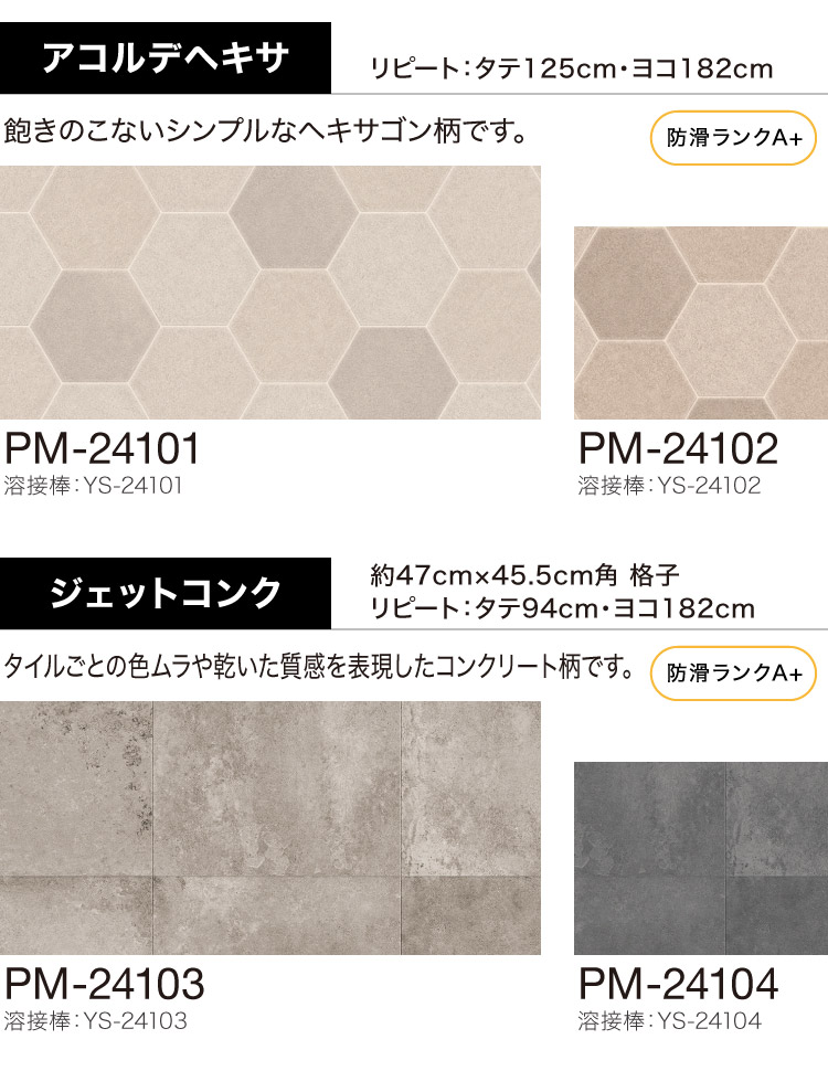 ●床材の色に合わせた溶接棒があります(熱溶接のために接着部分と床材に光沢の差が生じることがあります)。