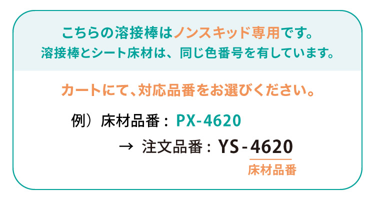 ● 施工するシート床材専用の溶接棒をご使用下さい。溶接棒とシート床材は、同じ色番号を有しています。